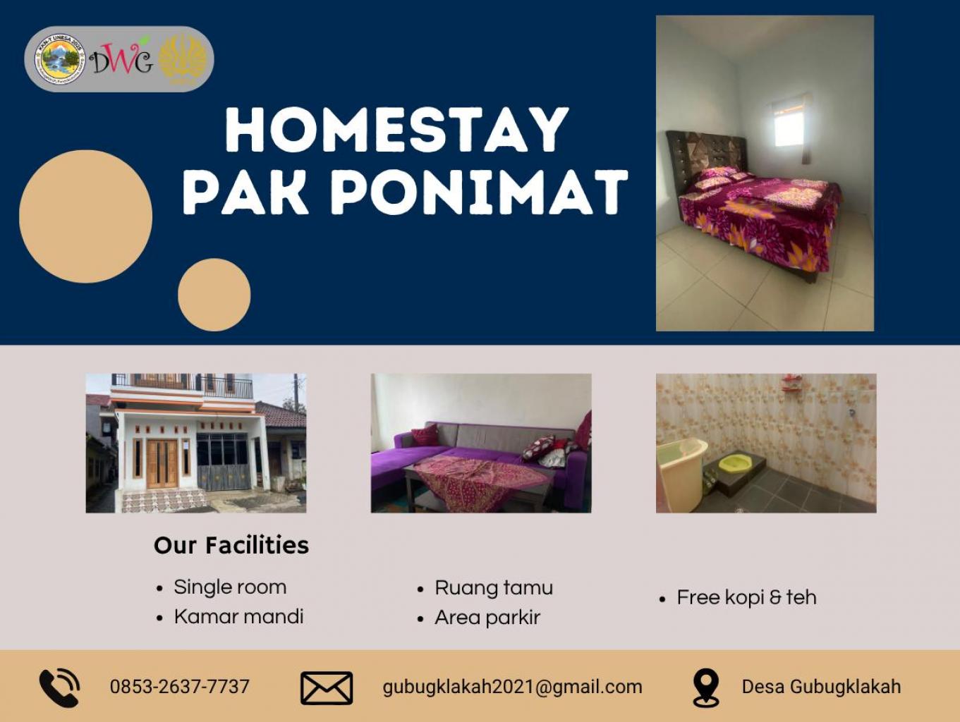Kamar di Homestay Pak Ponimat didesain sederhana namun tetap memberikan kenyamanan maksimal bagi para tamu. Ruangan dilengkapi dengan tempat tidur bersih dan rapi, selimut hangat, serta pencahayaan alami dari jendela yang menghadap ke area pedesaan yang sejuk. Tersedia juga lemari kecil untuk menyimpan barang pribadi dan colokan listrik di dekat tempat tidur untuk menunjang kebutuhan wisatawan. Suasana kamar yang bersih dan tenang menjadikan homestay ini pilihan tepat bagi wisatawan yang ingin beristirahat sebelum melanjutkan perjalanan menuju Gunung Bromo, Ranu Kumbolo, atau Semeru.